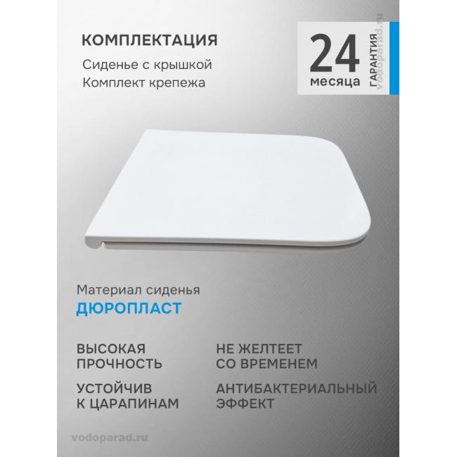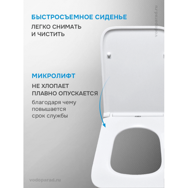 Ультратонкое сиденье из дюропласта не царапается, остаётся белоснежным на протяжении всего срока службы благодаря повышенной прочности и антибактериальным свойствам материала. Плавное и бесшумное опускание крышки сиденья благодаря микролифту и системе Soft Close обеспечивает комфорт при использовании. Сиденье легко снимается для уборки одним нажатием кнопки и также легко устанавливается обратно.