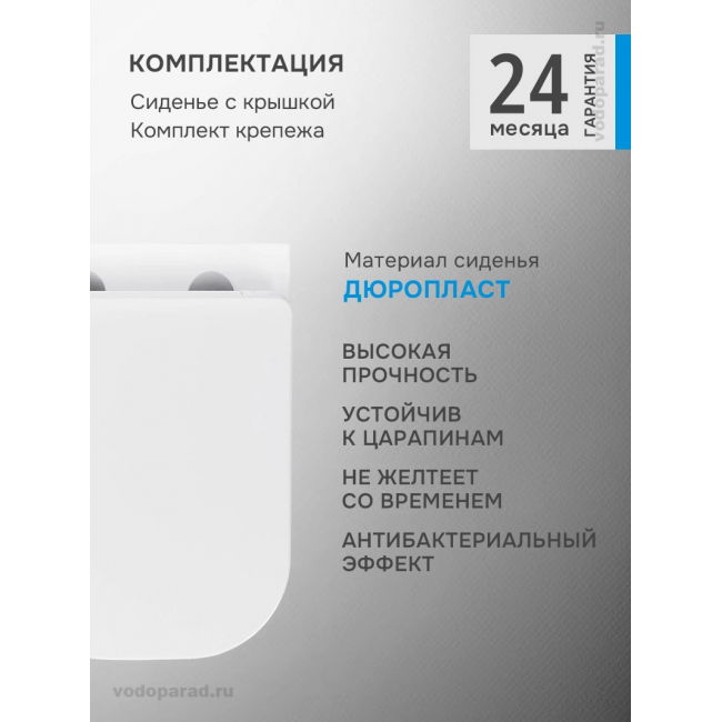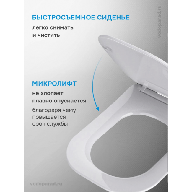 Ультратонкое сиденье из дюропласта не царапается, остаётся белоснежным на протяжении всего срока службы благодаря повышенной прочности и антибактериальным свойствам материала. Плавное и бесшумное опускание крышки сиденья благодаря микролифту и системе Soft Close обеспечивает комфорт при использовании. Сиденье легко снимается для уборки одним нажатием кнопки и также легко устанавливается обратно.