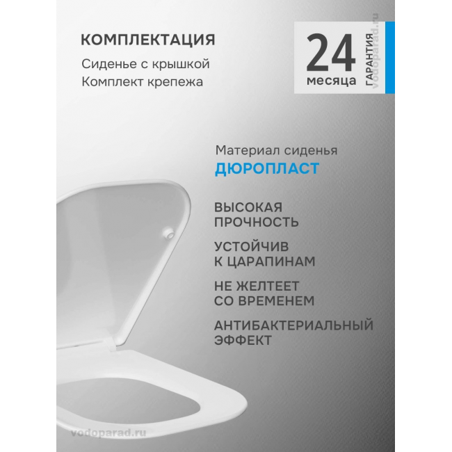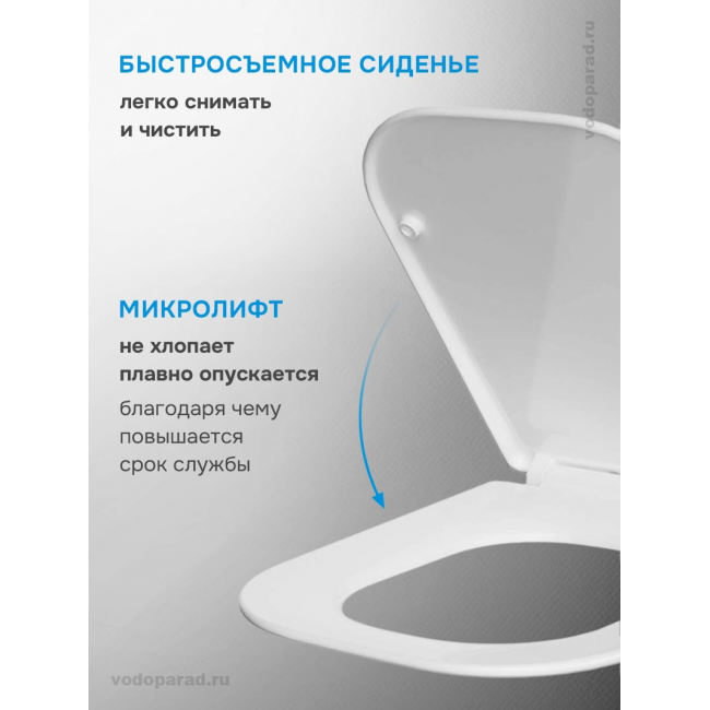 Ультратонкое сиденье из дюропласта не царапается, остаётся белоснежным на протяжении всего срока службы благодаря повышенной прочности и антибактериальным свойствам материала. Плавное и бесшумное опускание крышки сиденья благодаря микролифту и системе Soft Close обеспечивает комфорт при использовании. Сиденье легко снимается для уборки одним нажатием кнопки и также легко устанавливается обратно.