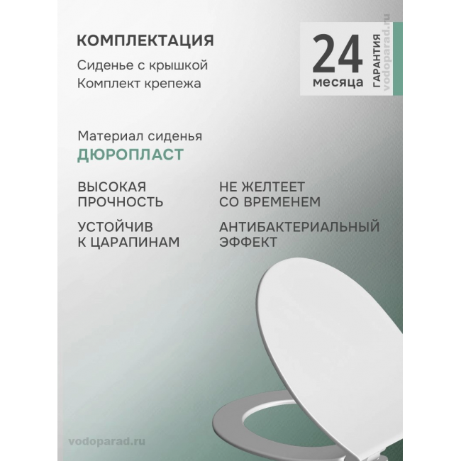 - Сиденья унитазов VitrA сделаны из дюропласта, поверхность которого практически несодержит пор. По заключению института гигиены дюропластовые сиденья VitrA противодействуют размножению бактерий.