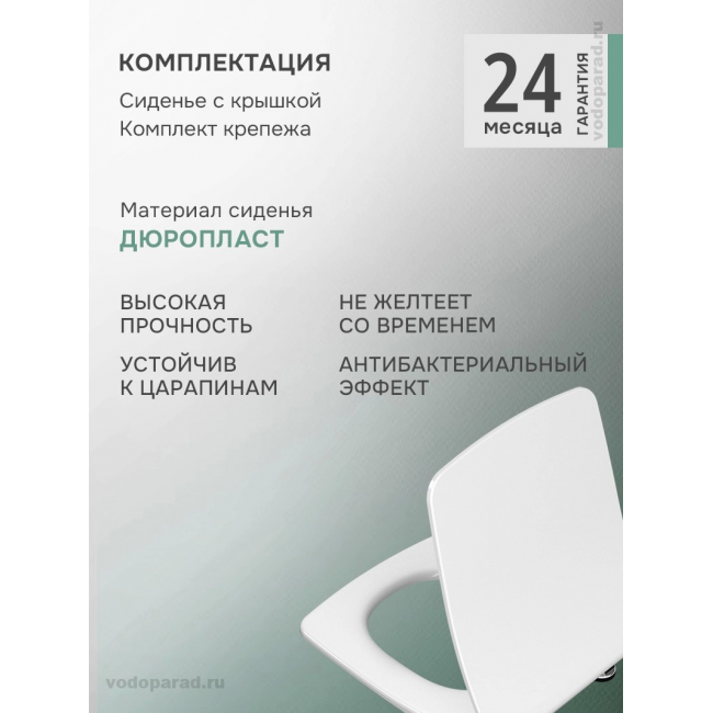 - Сиденья унитазов VitrA сделаны из дюропласта, поверхность которого практически несодержит пор. По заключению института гигиены дюропластовые сиденья VitrA противодействуют размножению бактерий.