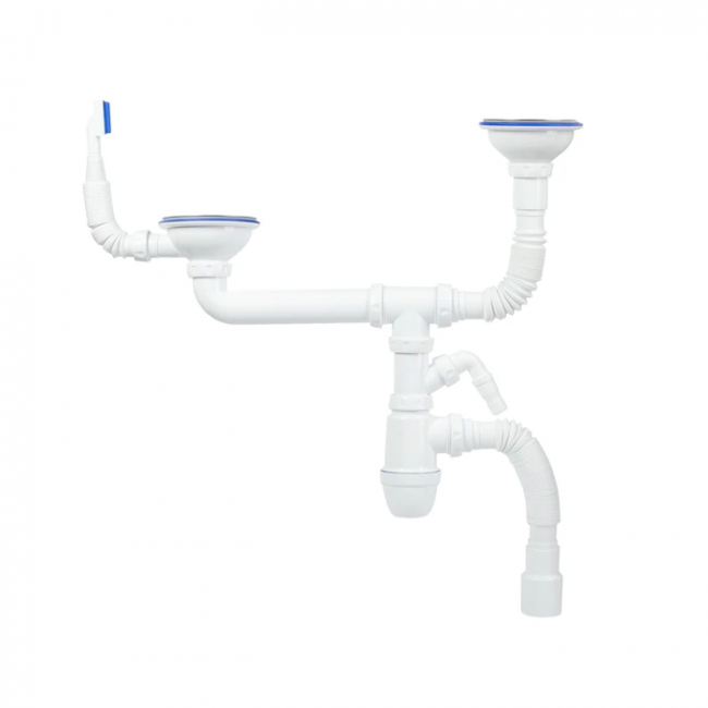 Сифон бутылочного типа для двойной мойки на кухню с переливом. Продуманная конструкция с учетом всех мелочей: отдельный отвод для посудомоечной машины, в комплекте гофрированные отводы для удобства подключения.