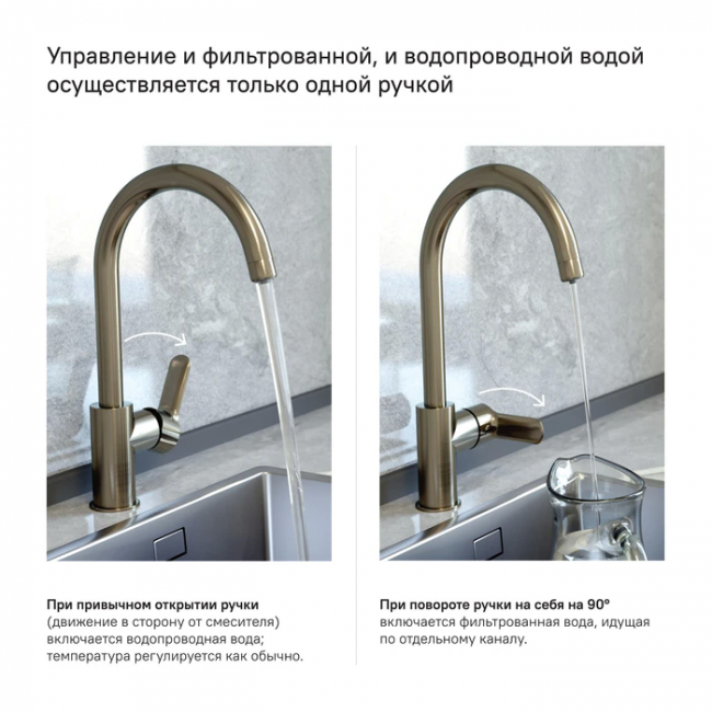 Смеситель для кухни Cuba в трендовом оттенке сатин с каналом для фильтрованной воды представляет уникальную технологию управления фильтрованной водой, которая практически не имеет аналогов. Теперь, чтобы налить стакан чистой воды, не нужна вторая ручка, — достаточно просто повернуть основную ручку в закрытом состоянии. Встроенный отдельный канал для фильтрованной воды позволяет, при подключении к любому фильтру, наслаждаться чистой питьевой водой прямо из смесителя. Нет необходимости устанавливать отдельный смеситель и сверлить под него отверстие. • Высокий поворотный излив делает смеситель более практичным.• Надежный корпус из прочной первичной латуни марки ЛЦ40С ГОСТ 17711-93 с пониженным содержанием свинца — стойкий к коррозии, резким изменениям давления и перепадам температуры воды.• Плавный ход ручки и абсолютная точность регулировки температуры и напора воды — за счет качественного керамического картриджа Softap. Он выдерживает максимальную температуру до 95С и гидроудар до 35 атмосфер, прошел тестир