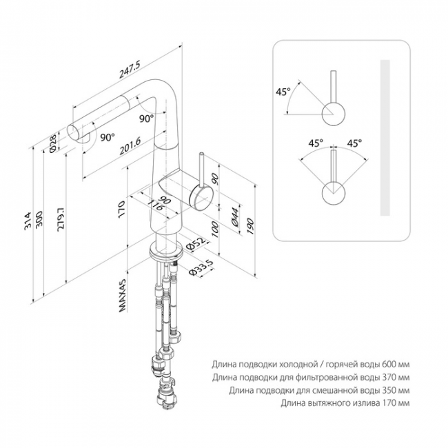 • Излив выдвигается на 65 см и позволяет дотянуться до всех углов мойки. Фильтрованная вода также подается из вытяжного излива.