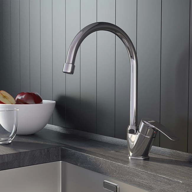 Смеситель для кухни IDDIS RAY RAYSB00i05 выполнен в стиле модерн и используется для подачи и смешивания горячей и холодной воды. Модель устанавливается на кухонную мойку, оснащена эргономичным рычагом, характеризующимся плавной работой и поворотным изливом. Однозахватный тип управления позволяет очень быстро и плавно регулировать подачу воды одной рукой. Силиконовый аэратор Neoperl® легко очищается от ржавчины и известковых отложений. Изделие выполнено из высококачественной латуни, которая отличается прочностью, долговечностью и устойчивостью к перепадам температур, с устойчивым к износу и эрозии комбинированным покрытием, благодаря которому не теряет презентабельный вид.