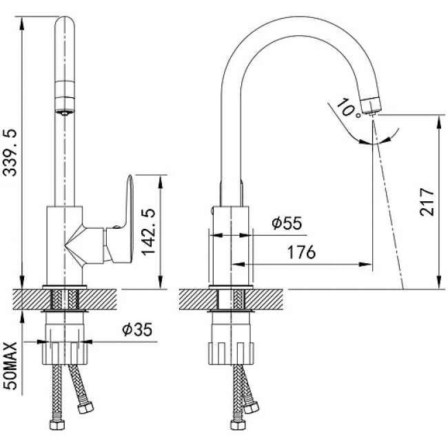 - Подключение к системе водоснабжения гибкой подводкой из нетоксичной EPDM резины в оплетке из нержавеющей стали, М10 - 1/2, длина 350 мм