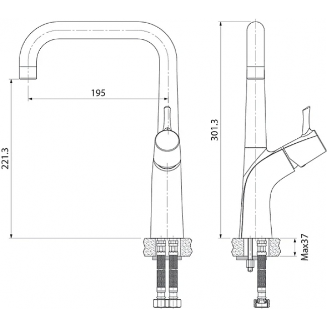 - Подключение к системе водоснабжения гибкой подводкой из нетоксичной EPDM резины в оплетке из нержавеющей стали, М10 - 1/2, длина 350 мм