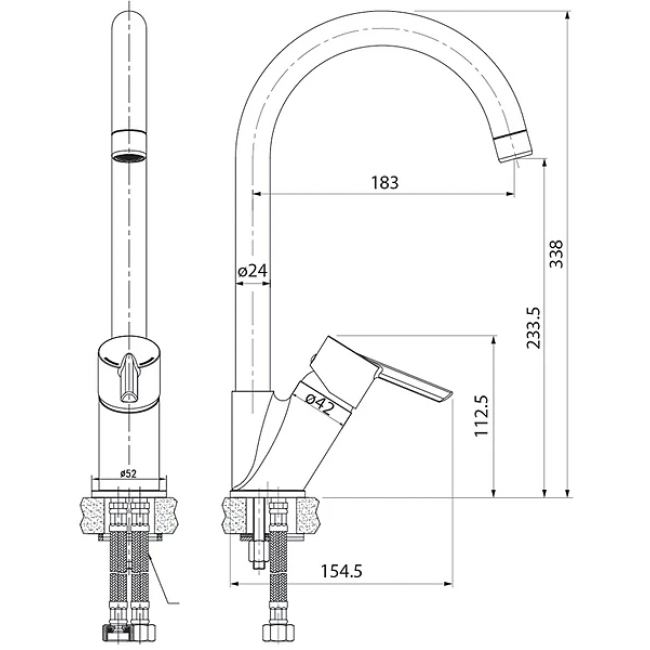 - Подключение к системе водоснабжения гибкой подводкой из нетоксичной EPDM резины в оплетке из нержавеющей стали, М10 - 1/2, длина 350 мм