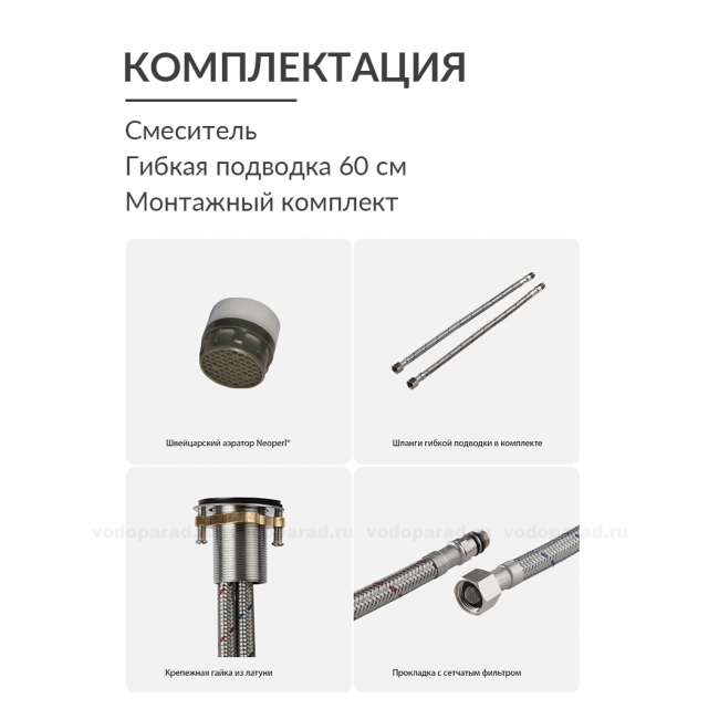 | Комплектация | 1. Смеситель 2. Гибкая подводка 60см 3. Монтажный комплект 4. Слив-перелив и донный клапан в комплект не входят |