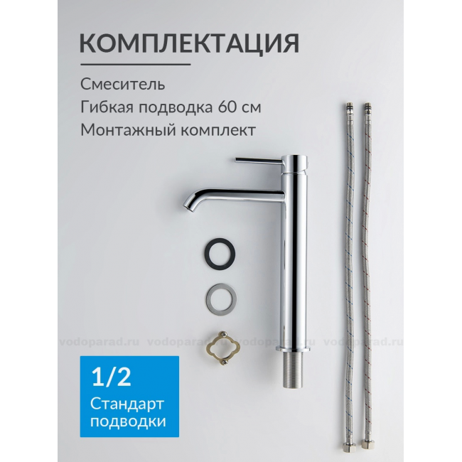 | Комплектация | 1. Смеситель 2. Гибкая подводка 60см 3. Монтажный комплект 4. Слив-перелив и донный клапан в комплект не входят |