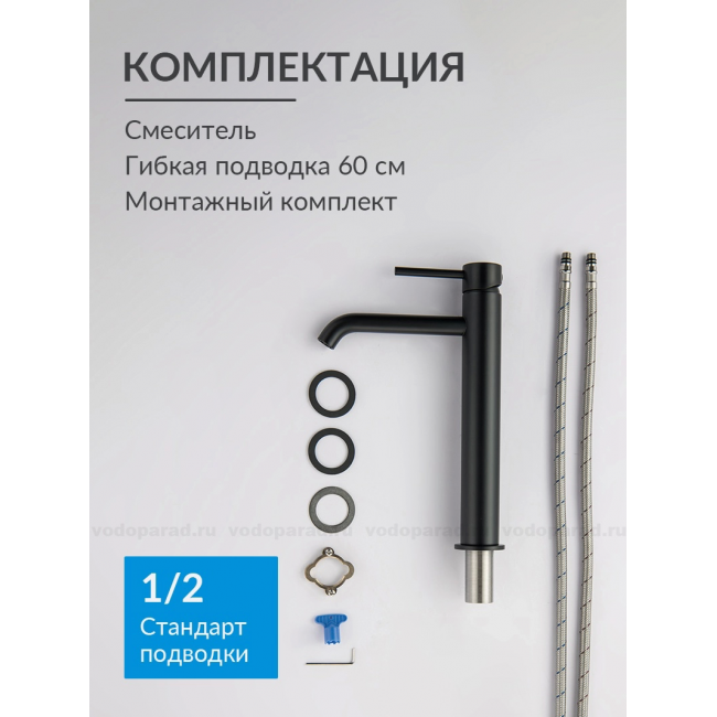 | Комплектация | 1. Смеситель 2. Гибкая подводка 60см 3. Монтажный комплект 4. Слив-перелив и донный клапан в комплект не входят |