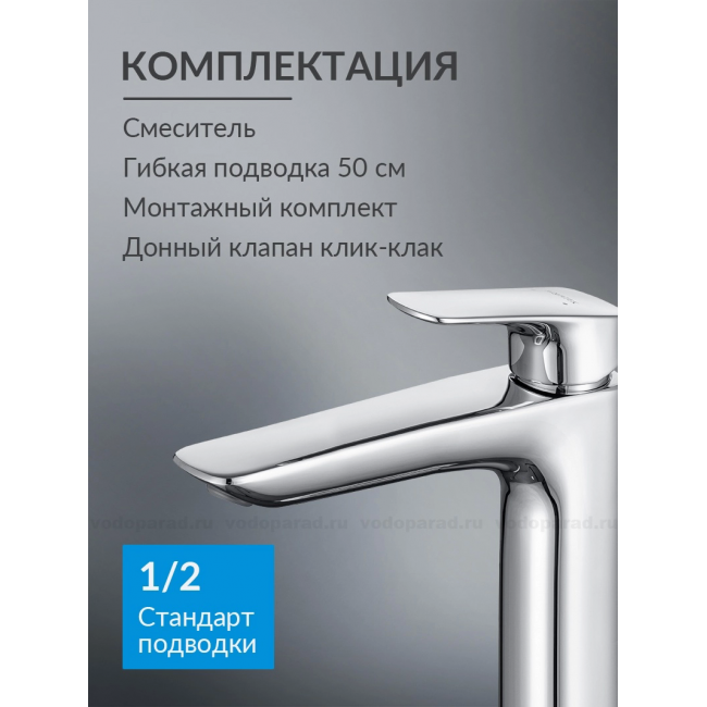| Комплектация | 1. Смеситель2. Гибкая подводка 50см3. Монтажный комплект4. Донный клапан клик-клак |