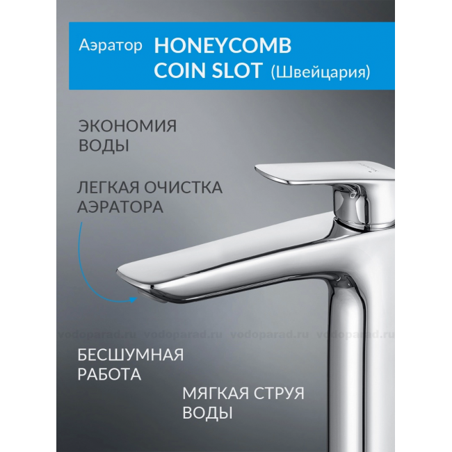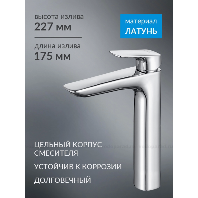 ОПИСАНИЕ- оснащен высоким изливом, удобен для мытья крупных предметов;- однорычажная система регулировки силы струи и температуры воды;- цельный корпус смесителя снижает вероятность протечек;- легкая очистка аэратора;- донный клапан клик-клак из нержавеющей стали марки SUS 304 в цвет смесителя в комплекте;- оптимальная длинна подводки;