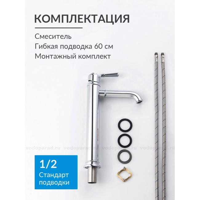| Комплектация | 1. Смеситель 2. Гибкая подводка 60см 3. Монтажный комплект 4. Слив-перелив и донный клапан в комплект не входят |