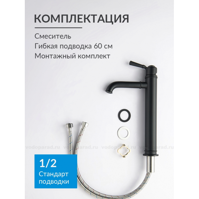 | Комплектация | 1. Смеситель 2. Гибкая подводка 60см 3. Монтажный комплект 4. Слив-перелив и донный клапан в комплект не входят |