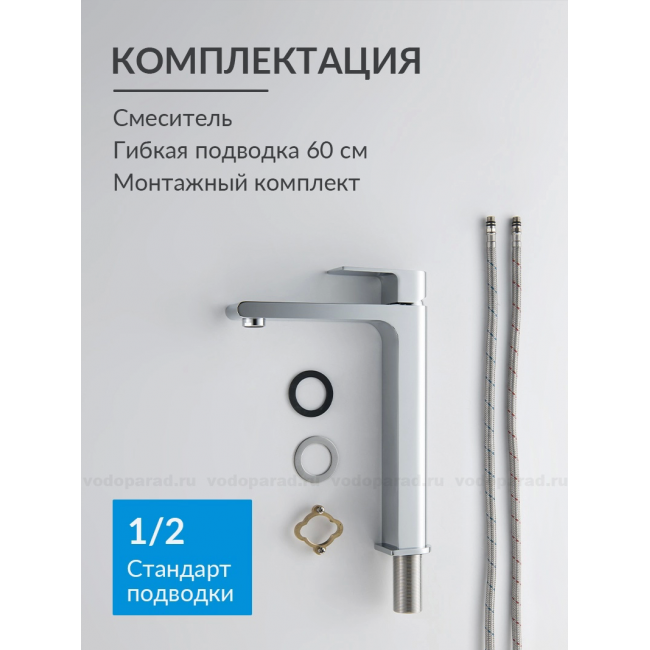 | Комплектация | 1. Смеситель 2. Гибкая подводка 60см 3. Монтажный комплект 4. Слив-перелив и донный клапан в комплект не входят |