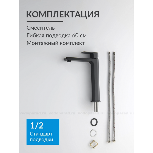 | Комплектация | 1. Смеситель 2. Гибкая подводка 60см 3. Монтажный комплект 4. Слив-перелив и донный клапан в комплект не входят |