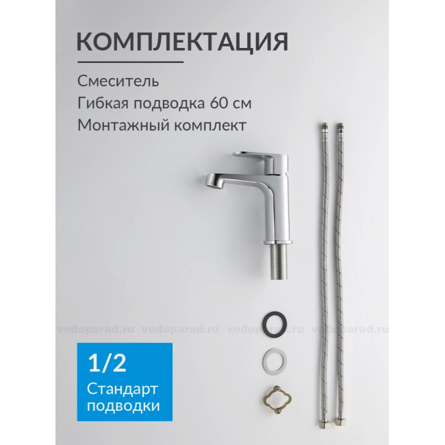 | Комплектация | 1. Смеситель 2. Гибкая подводка 60см 3. Монтажный комплект 4. Слив-перелив и донный клапан в комплект не входят |