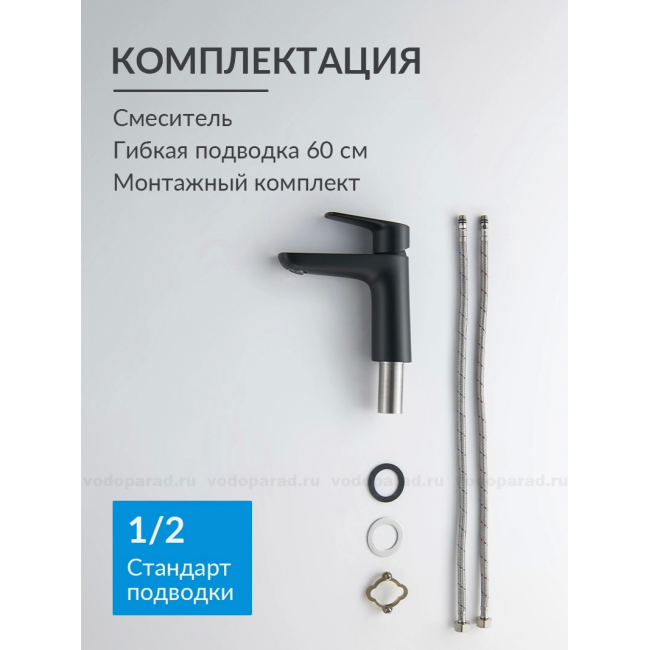 | Комплектация | 1. Смеситель 2. Гибкая подводка 60см 3. Монтажный комплект 4. Слив-перелив и донный клапан в комплект не входят |