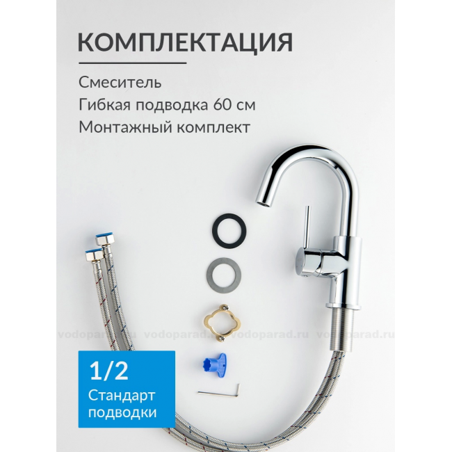 | Комплектация | 1. Смеситель 2. Гибкая подводка 60см 3. Монтажный комплект 4. Слив-перелив и донный клапан в комплект не входят |