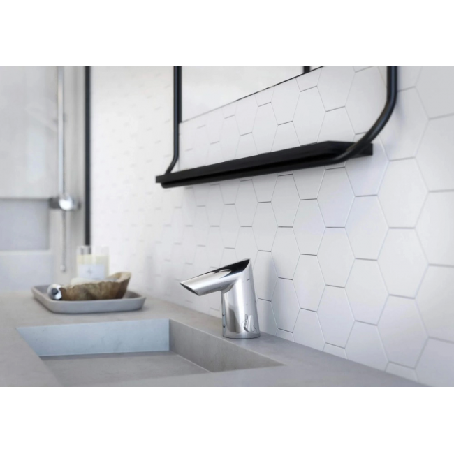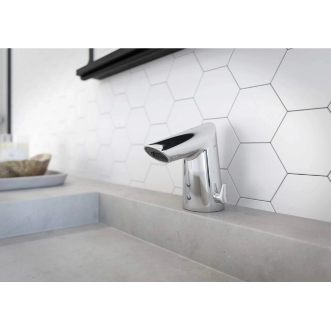 На корпусе данного смесителя предусмотрена рукоятка для регулировки температуры воды. Оптимальную температуру можно установить одним движением руки и во время использования смесителя больше её не регулировать. В результате пользователь избегает прикосновений к сантехнике после мытья рук, а вода и энергия расходуются экономно. Кроме того, рукоятка регулировки воды может быть снята, а на её место установлена заглушка. В этом случае пользователь не имеет возможности производить регулировку во время эксплуатации.