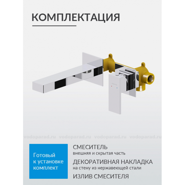 | Комплектация | 1. Смеситель (внешняя и скрытая часть) 2. Декоративная накладка на стену из нержавеющей стали 5 мм 3. Излив смесителя |
