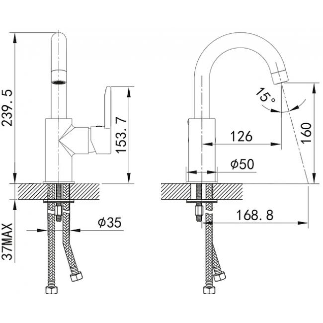 - Подключение к системе водоснабжения гибкой подводкой из нетоксичной EPDM резины в оплетке из нержавеющей стали, М10 - 1/2