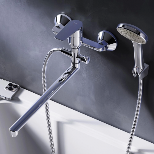 Стильное универсальное решение для ванной комнаты - качественный смеситель для ванны и душа с длинным поворотным изливом с душевым набором. Универсальный длинный излив позволяет иcпользовать смеситель как для ванны так и для рядом стоящей раковины. Функциональный держатель для ручного душа на два положения добавит удобства использования. Душевой шланг длиной 150 см позволит наслаждаться душем даже высокому человеку. Максимум функций за разумную плату в одном изделии! Ультрамодный дизайн ручки придает смесителю дополнительную динамику и дарит непревзойденную легкость управления. Вы почувствуете это с первого прикосновения. Точная инженерия для Вашего комфорта: благодаря обширной зоне движения ручки управлять температурой воды стало еще проще.