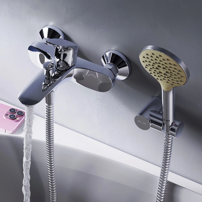 Впервые модный дизайнерский смеситель в доступном сегменте: ультрамодный стиль Dynamic Organic — природные формы в сочетании с четкими линиями доведенными до совершенства человеком. Дизайн в котором учтены все детали: благодаря уникальной форме ручки капли воды скатываются предотвращая образование налета а не высыхают на поверхности. Эксклюзивная разработка: специально спроектированный для АМ.РМ керамический картридж SoftMotion 35 мм обеспечивает широкую зону движения ручки для оптимальной регулировки температуры и напора а также позволяет выдерживать любые перепады давления. Переключение режимов «ванна-душ» больше не доставит хлопот: идеальное сочетание пневматического переключения с механическим срабатывает безукоризненно в 100% случаев даже при низком напоре воды.В комплекте душевой набор: стильный ручной душ 120 мм 3 режима настенный держатель с регулировкой угла наклона душевой шланг с защитой от скручивания.