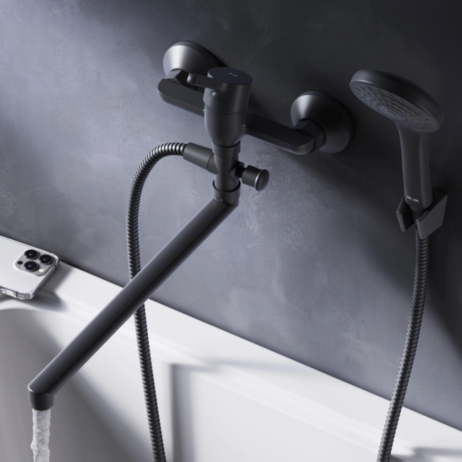 Стильное универсальное решение для ванной комнаты - качественный смеситель для ванны и душа с длинным поворотным изливом с душевым набором. Универсальный длинный излив позволяет использовать смеситель как для ванны так и для рядом стоящей раковины. Функциональный держатель для ручного душа на два положения добавит удобства использования. Душевой шланг длиной 150 см позволит наслаждаться душем даже высокому человеку. Максимум функций за разумную плату в одном изделии! Ультрамодный дизайн ручки придает смесителю дополнительную динамику и дарит непревзойденную легкость управления. Вы почувствуете это с первого прикосновения. Точная инженерия для Вашего комфорта: благодаря обширной зоне движения ручки управлять температурой воды стало еще проще.