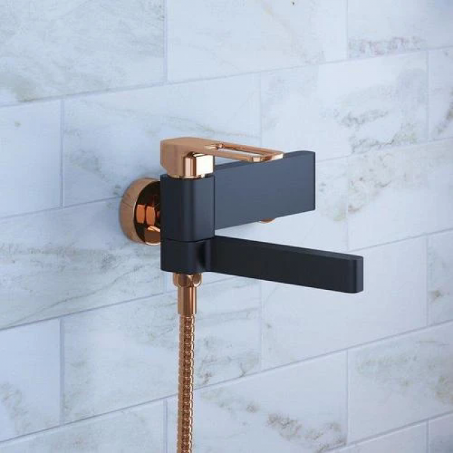 Смеситель для ванны, однозахватный, латунь, покрытие "черный матовый/розовое золото", керамический дивертор в изливе, керамический картридж Softap 35 мм, пластиковый аэратор Neoperl, излив складывается под корпус. Комплектация: эксцентрики с отражателями, крепеж, черный душевой шланг из ПВХ, черная душевая рейка из ABS-пластика, черный настенный держатель из ABS-пластика. Упаковка: картонная коробка, микрогофрокартон, индивид. мешок.