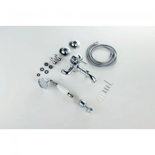 | Комплектация | 1. Смеситель 2. Душевой гарнитур (лейка, шланг, настенный держатель для лейки) 3. S-образные эксцентрики 4. Декоративные отражатели |