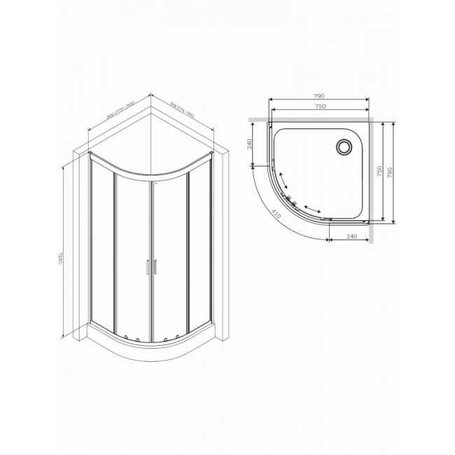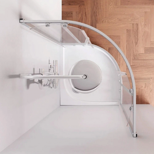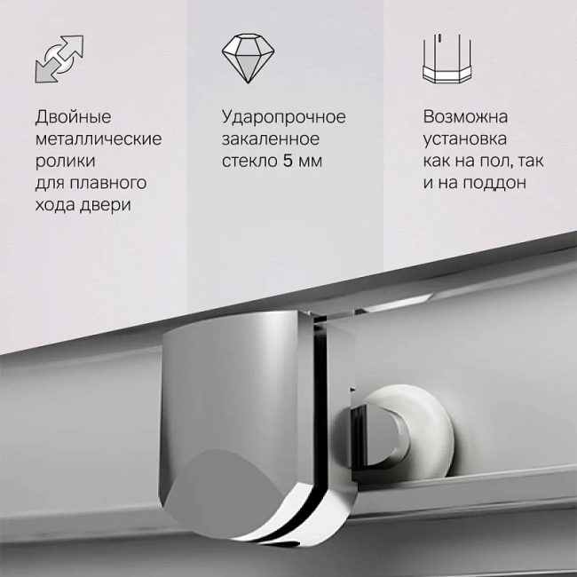 Система крепления профилей QuickFix - простой и быстрый монтаж душевого ограждения. Надежные хромированные двойные ролики – не менее 150 000 открываний. Прозрачное закаленное стекло толщиной 5 мм. Ручка из алюминия. Высота ограждения без поддона 1900 мм.