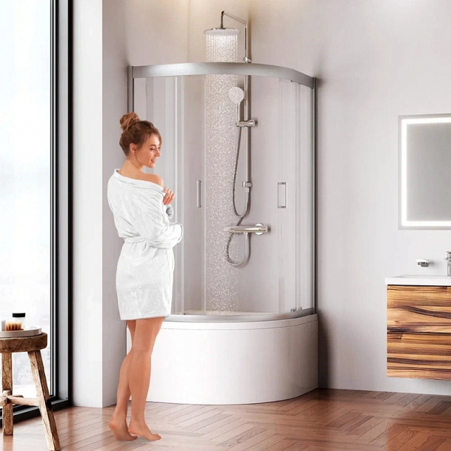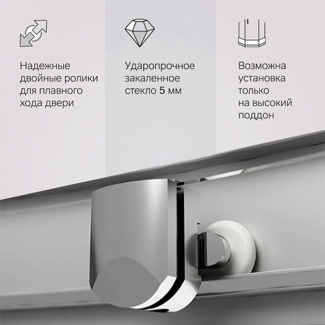 Cистема крепления профилей QuickFix. Простой и быстрый монтаж душевого ограждения. Надежные хромированные двойные ролики – Не менее 150 000 открываний. Прозрачное закаленное стекло толщиной 5 мм. Ручка из анодированного алюминия.