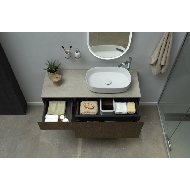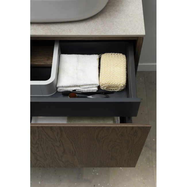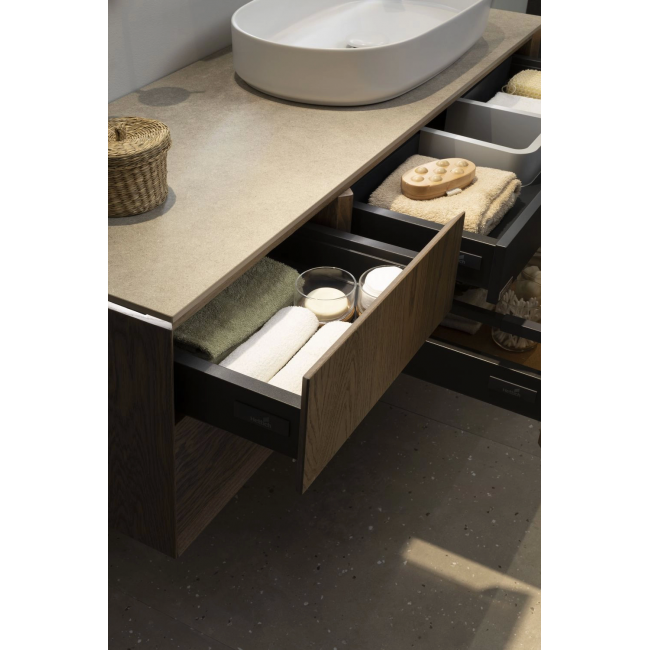 Выдвижные ящики с металлическими боковыми стенками в цвете серый металлик.