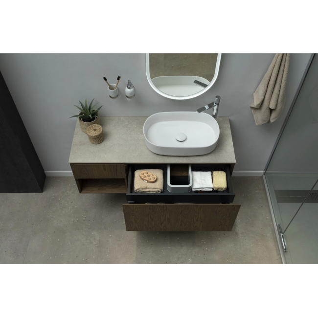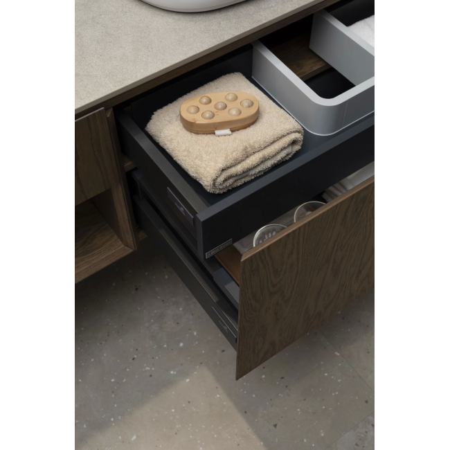 Выдвижные ящики с металлическими боковыми стенками в цвете серый металлик.