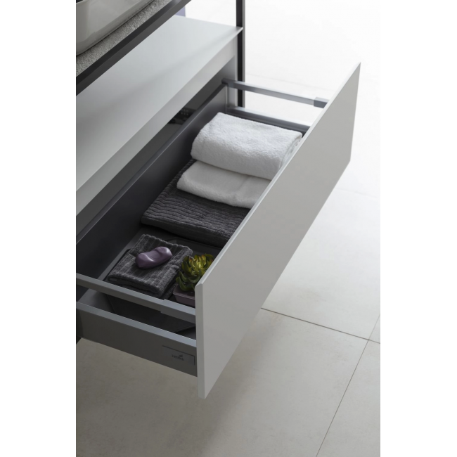 Выдвижные ящики с металлическими боковыми стенками в цвете серый металлик.