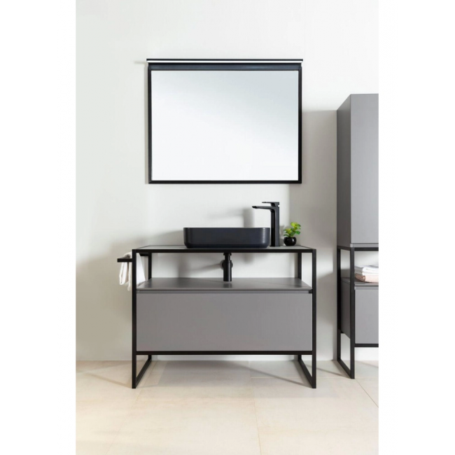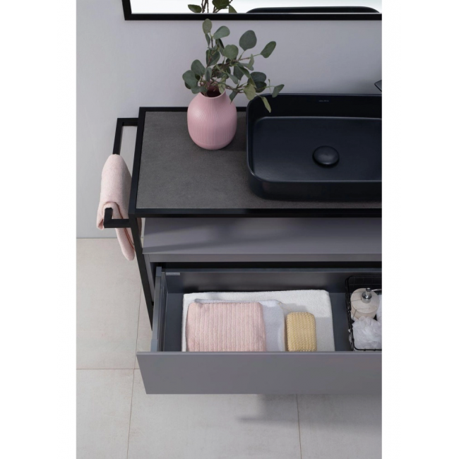 Стильные каркасы тумб и пеналов выполнены из металла, имеют брашированную поверхность с нанесением цвета путем анодирования.