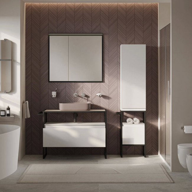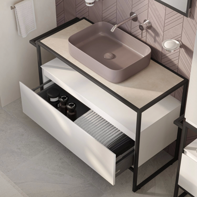 Стильные каркасы тумб и пеналов выполнены из металла, имеют брашированную поверхность с нанесением цвета путем анодирования.