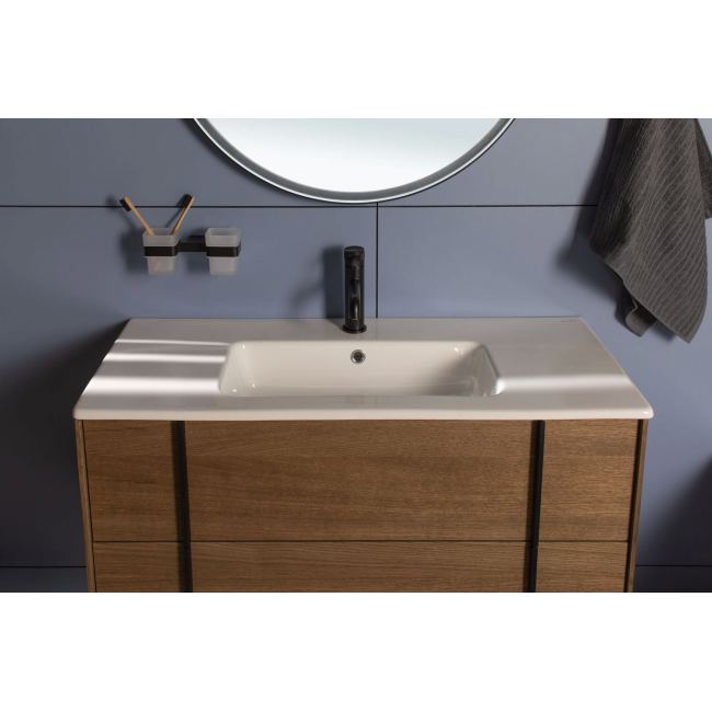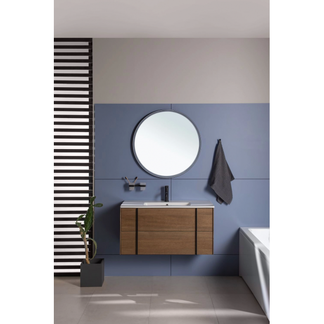 Изюминкой коллекции являются стильные и оригинальные металлические ручки, которые образуют единую линию с ножками тумбы и пенала. Ручки, опоры и зеркала коллекции REALITY выполнены из металла в цветах: черный браш или латунь браш.