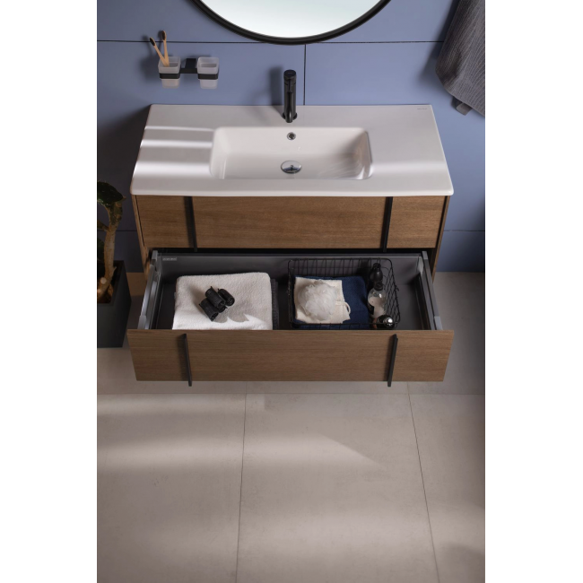 Тумбы оснащены специальной пластиковой рамой, которая надежно защищает вырез под сифон, служит органайзером и позволяет закрепить дополнительный набор контейнеров для хранения.