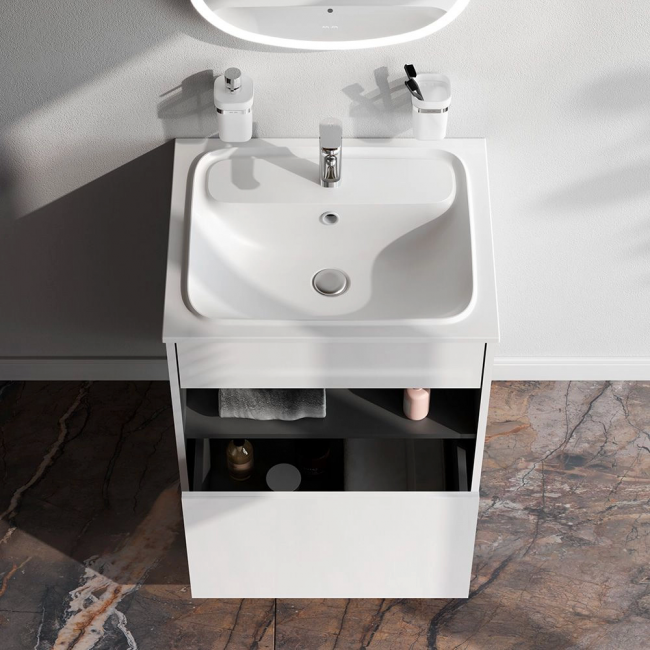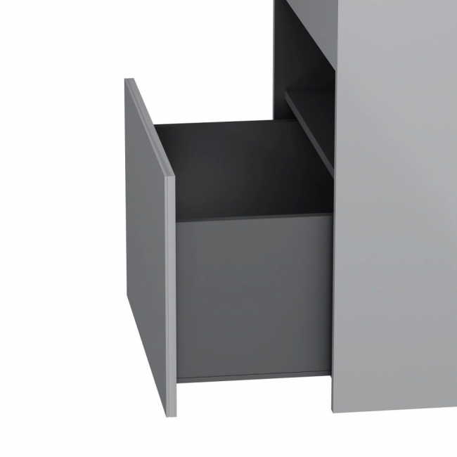 Удобный выдвижной ящик и вместительная открытая ниша позволяют хранить все необходимые средства под рукой. Невероятно мягкое открытие и закрытие благодаря направляющим скрытого монтажа с системой soft close.