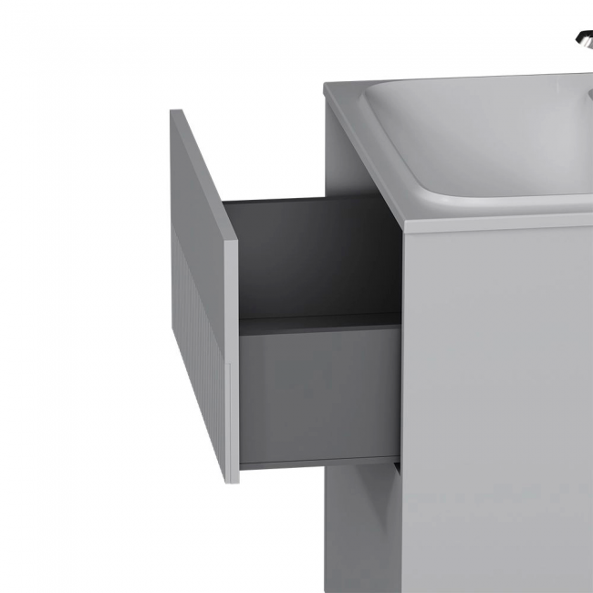 Удобный выдвижной ящик позволит хранить все необходимые средства под рукой. Невероятно мягкое открытие и закрытие благодаря направляющим скрытого монтажа с системой soft close.