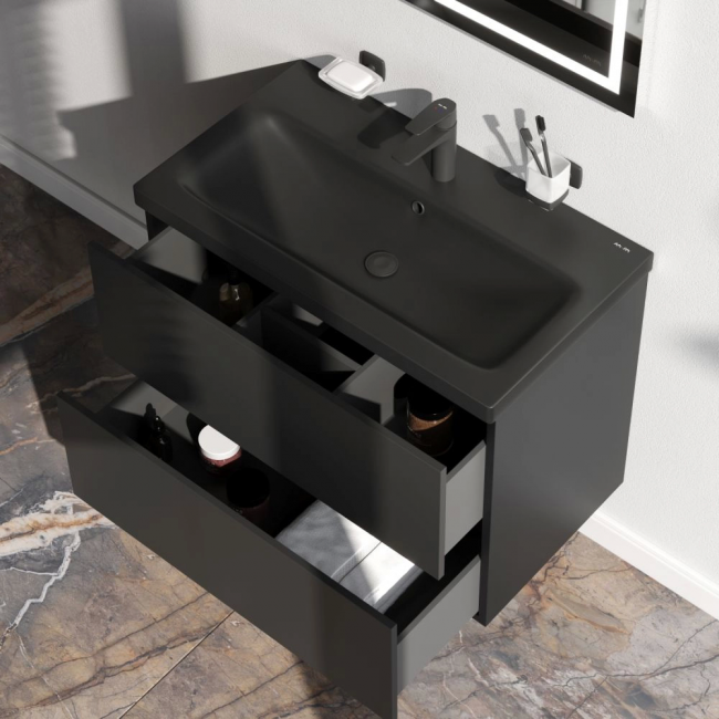 Трендовый дизайн мебели для ванной комнаты Gem не уступает комплектам по гораздо более высокой цене. Теперь цветовая палитра коллекции Gem дополнена стильным матовым черным цветом!