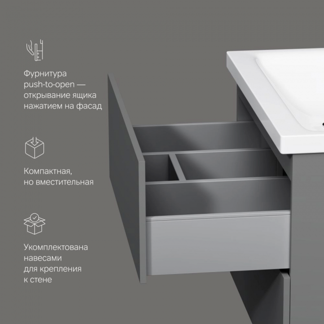 Фурнитура push-to-open - открывание ящика нажатием на фасад. Ящики с антискользящим покрытием цвета антрацит – европейский стандарт.