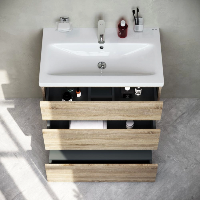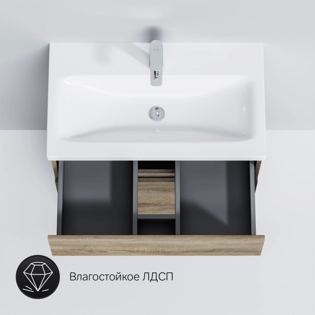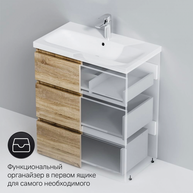 Уникальный нижний ящик базы может быть использован как: выдвижная подставка для детей для удобного мытья рук (выдерживает нагрузку до 60 кг) дополнительная ниша для хранения (экономия пространства ванной комнаты). Ящики с антискользящим покрытием цвета антрацит – европейский стандарт.