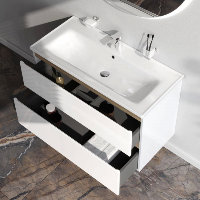Функциональный органайзер в первом ящике позволит хранить необходимые косметические средства под рукой и в полном порядке. Внутреннее покрытие каждого ящика выполнено в современном цвете Anthracite и имеет противоскользящее покрытие.? Встроенная керамическая раковина белоснежного цвета оснащена специальным бортиком для защиты от пролива воды за мебель.