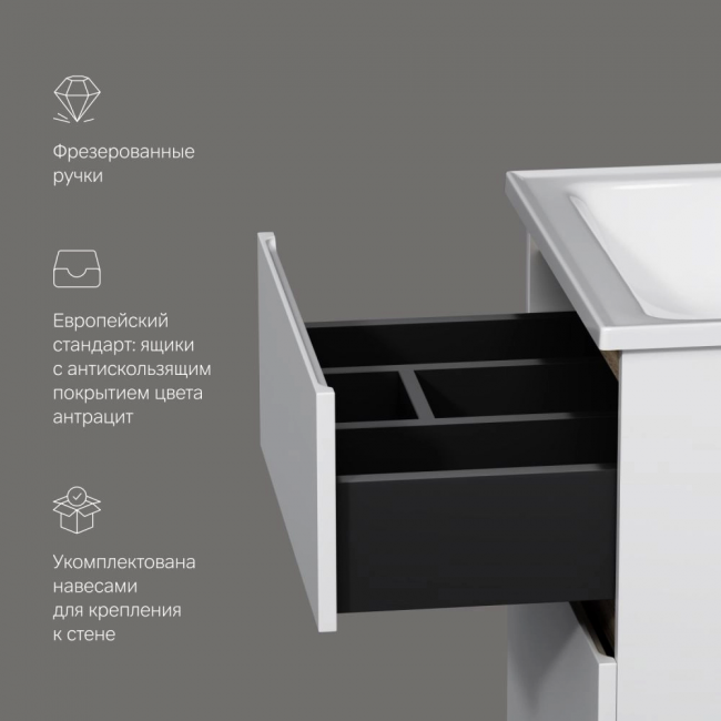 цвете Anthracite и имеет противоскользящее покрытие.? Встроенная керамическая раковина белоснежного цвета оснащена специальным бортиком для защиты от пролива воды за мебель.