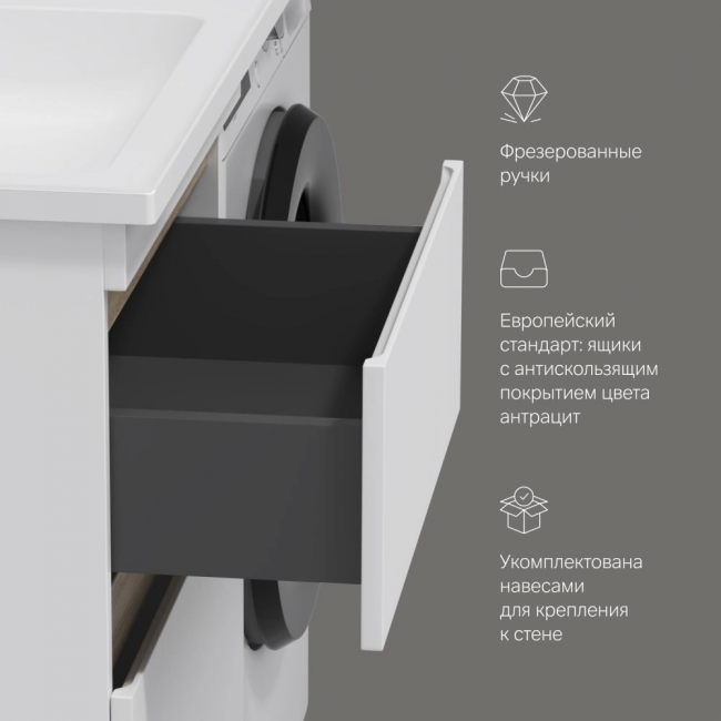 Глубокие удобные ящики позволяют организовать и хранить все необходимые средства под рукой. Внутреннее покрытие каждого ящика выполнено в современном цвете Anthracite и имеет противоскользящее покрытие. Накладная раковина из литьевого мрамора белоснежного цвета оснащена съемной мыльницей специальным бортиком для защиты от пролива воды за мебель и скрытым сливом.