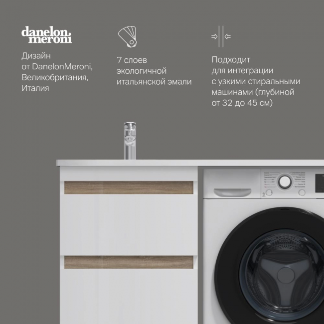 Долгожданное расширение в мебели X-Joy. Самое оптимальное и функциональное решение для организации пространства ванной комнаты с учетом размещения в ней стиральной машины. Подходит для интеграции с узкими стиральными машинами (глубиной от 32 до 45 см). Эстетичное сочетание цветов и фактур от дизайн-бюро Danelon Meroni (Великобритания & Италия): белые глянцевые фасады дополнены отделкой под светлое дерево.